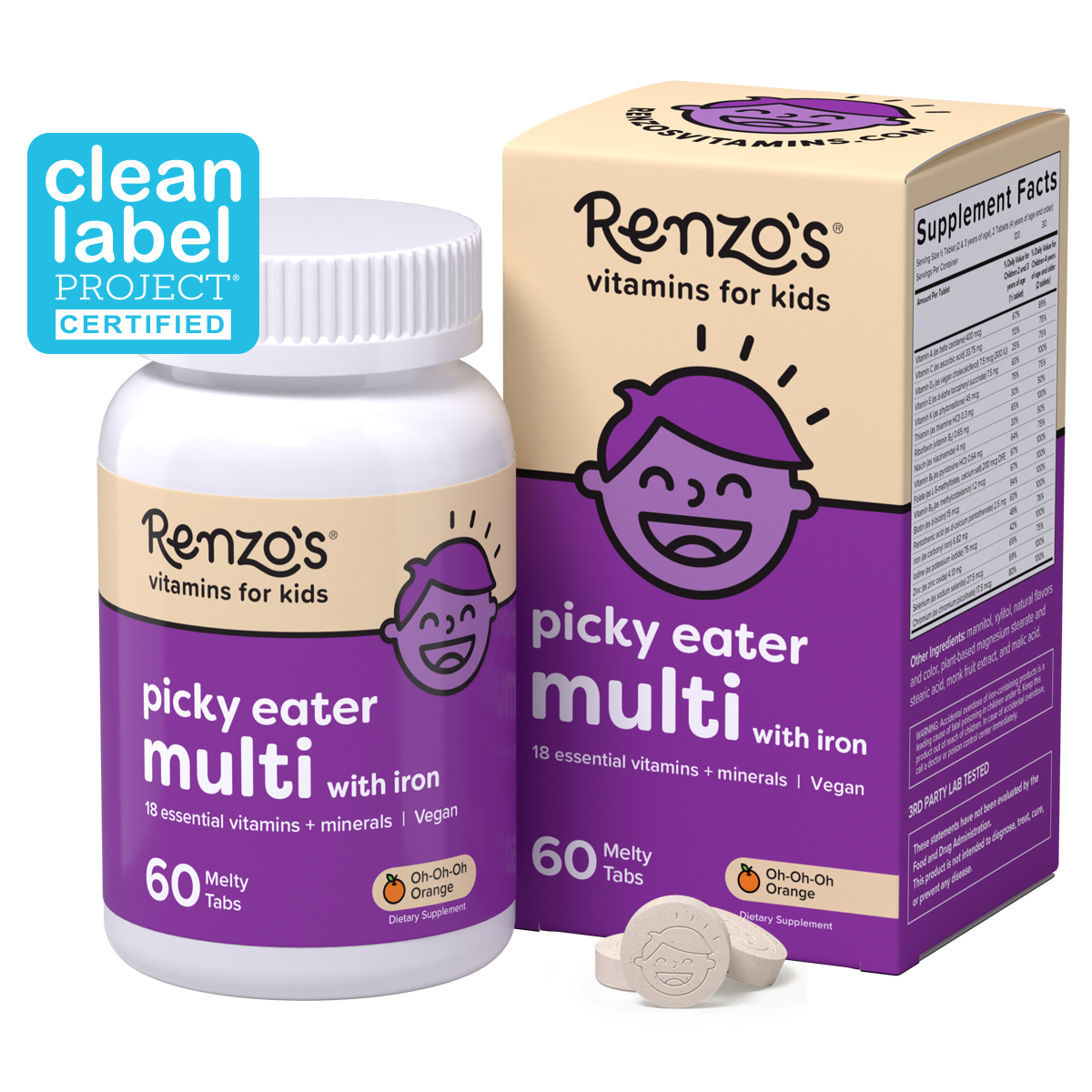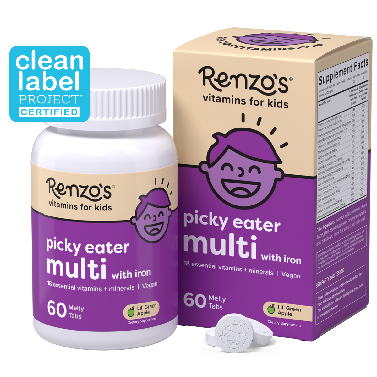 Renzo’s Picky Eater Multi is a gummy-free, no sugar vitamin designed to melt-in-your-mouth. It’s formulated with 18 essential vitamins and minerals, including folic acid as L-5-methylfolate and vitamin B12 as methylcobalamin, plant-based vitamin D3, gentle iron, and much more. Each Melty Tab delivers essential nutrients kids need without artificial flavors, sweeteners, or unnecessary junk—making it a kid-favorite parent-approved choice for daily nutrition.