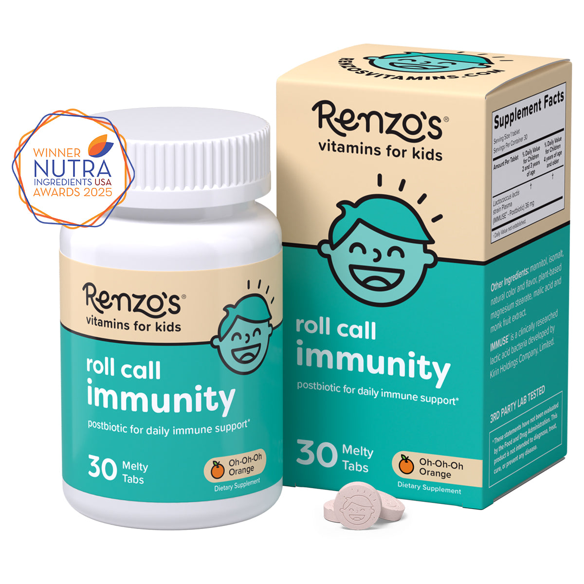 Renzo’s Roll Call Immunity is a sugar-free, melt-in-your-mouth supplement designed to support kids' immune health at the cellular level. Featuring IMMUSE® (Lactococcus lactis strain Plasma, LC-Plasma), a clinically researched postbiotic, this formula helps activate immune cells to keep your child’s defenses strong year-round. With a delicious orange flavor, no artificial ingredients, and a kid-friendly format, Roll Call Immunity is the parent-approved way to help kids stay healthy and resilient.